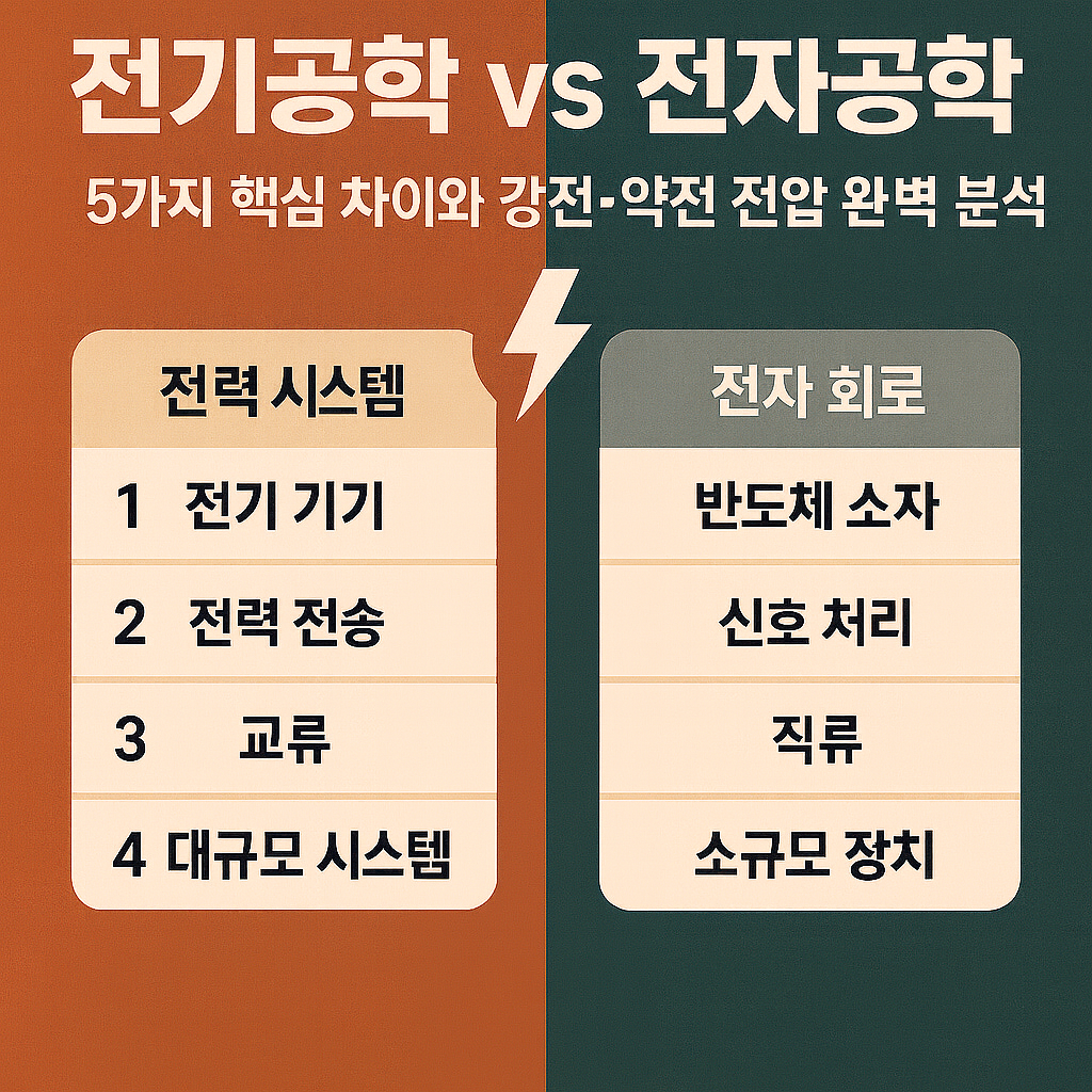 전기공학과 전자공학의 차이는 크게 5가지로 요약할 수 있습니다. 이 다섯 가지 핵심 포인트를 머릿속에 단단히 박아두면, 두 분야에서 어떤 일을 하게 될지, 어떤 기술을 배우게 될지 훨씬 선명해질 것입니다.